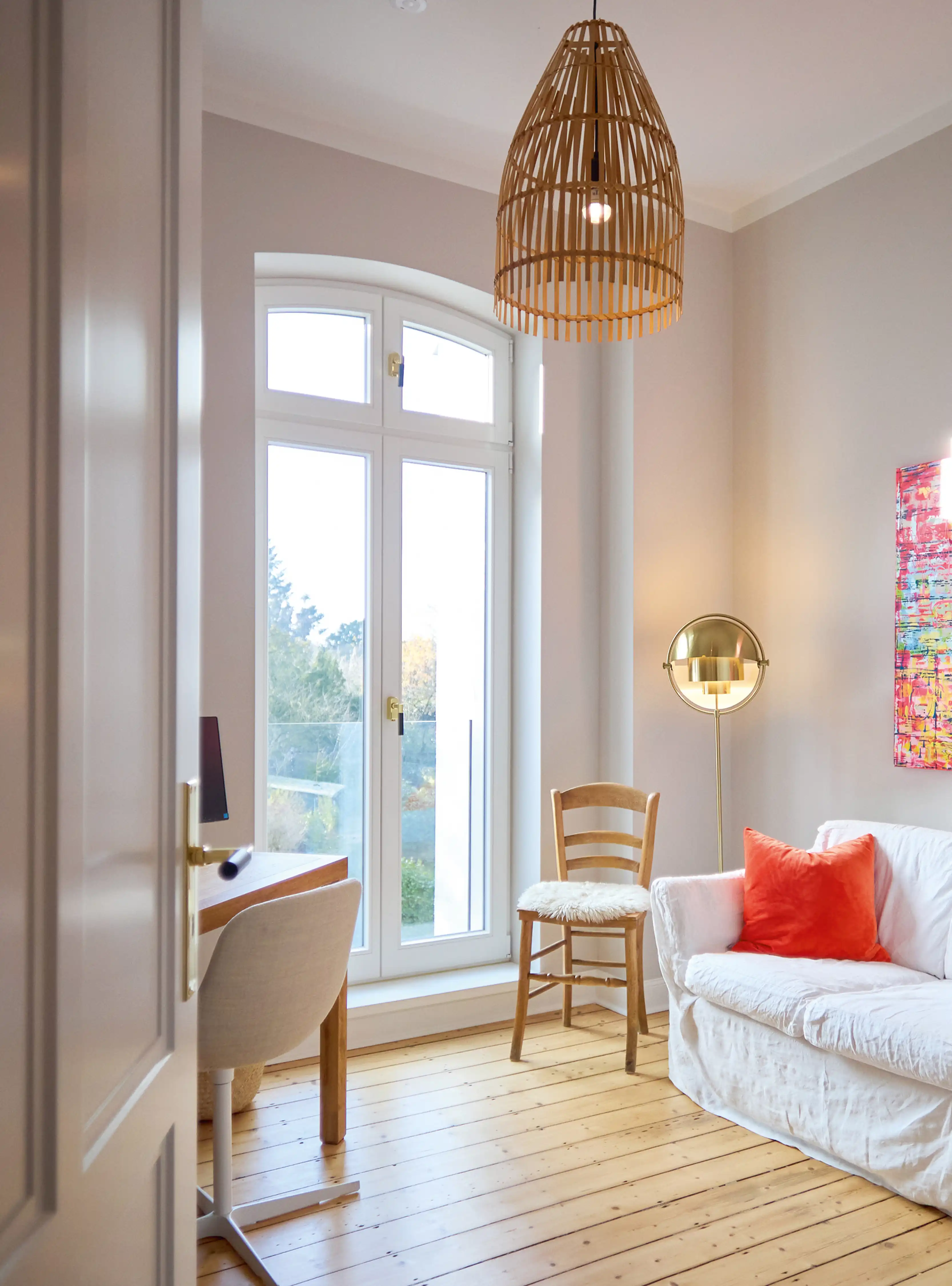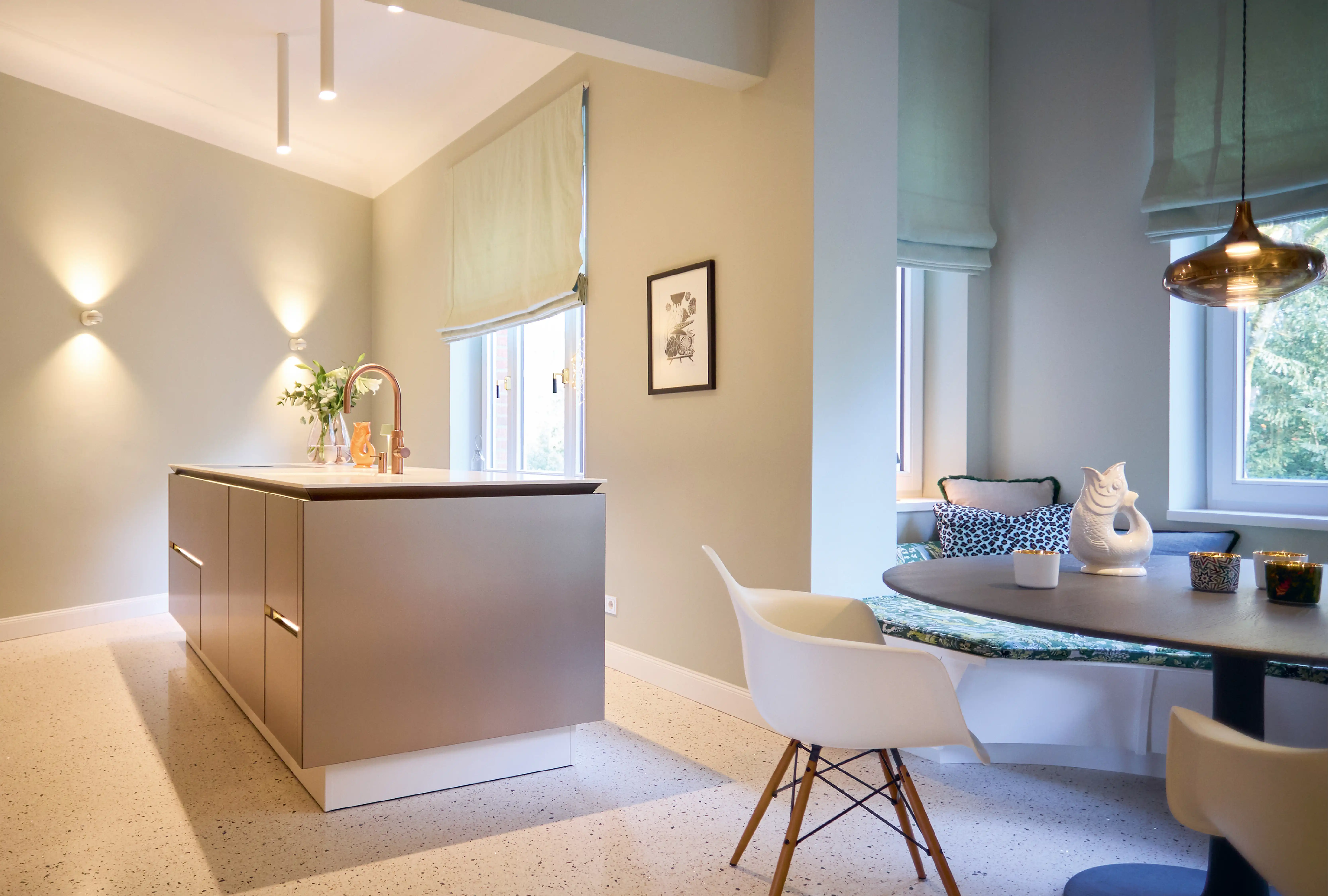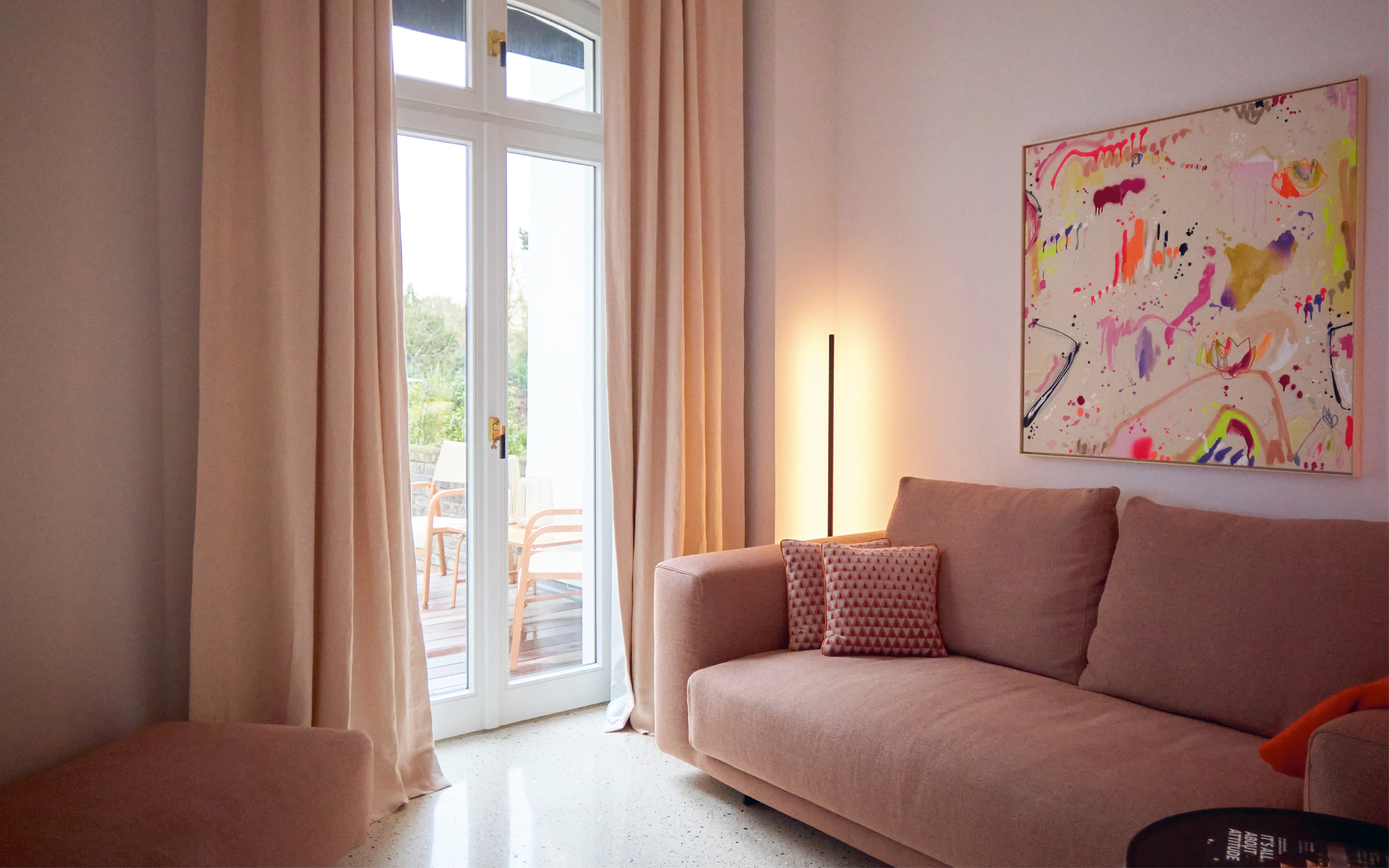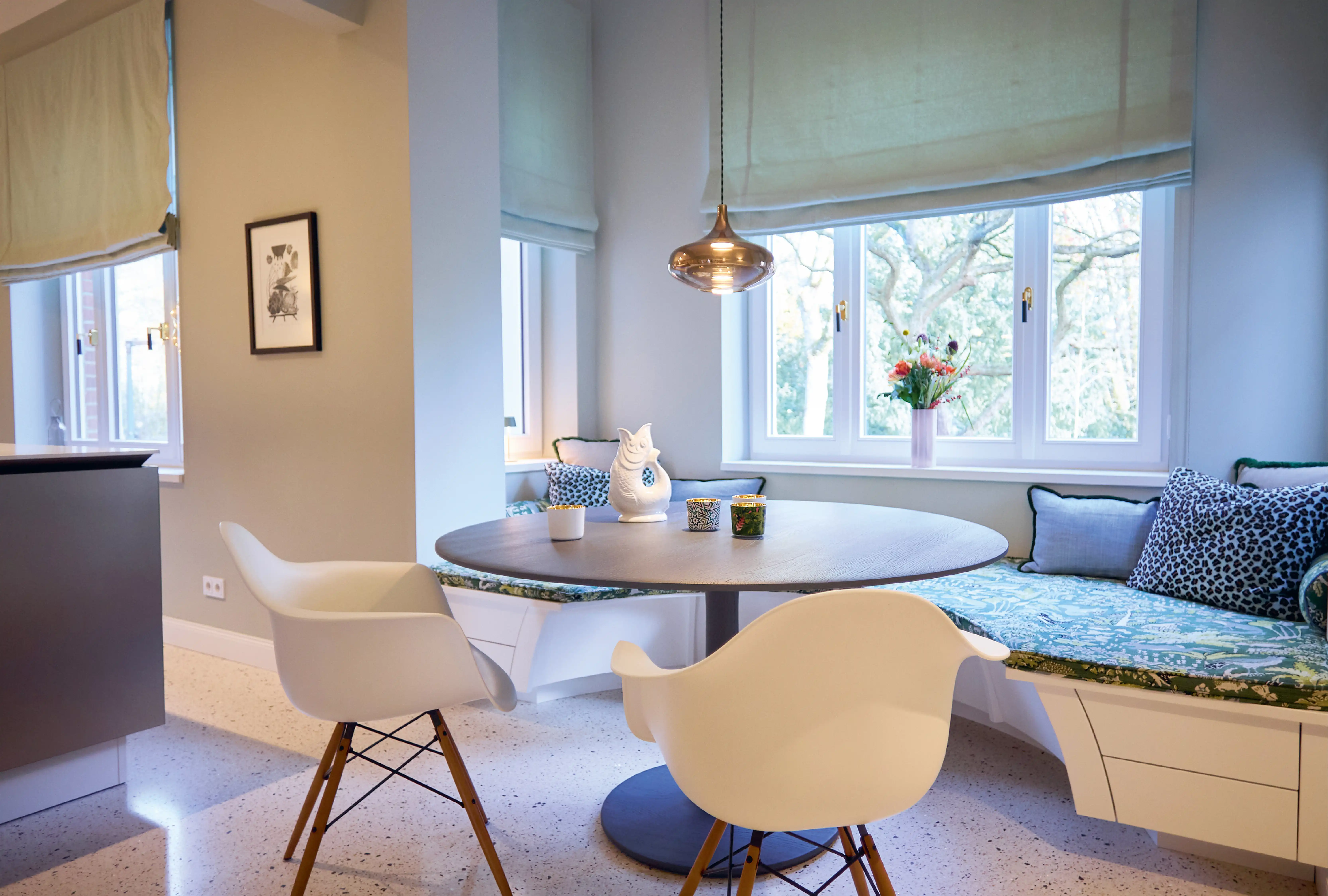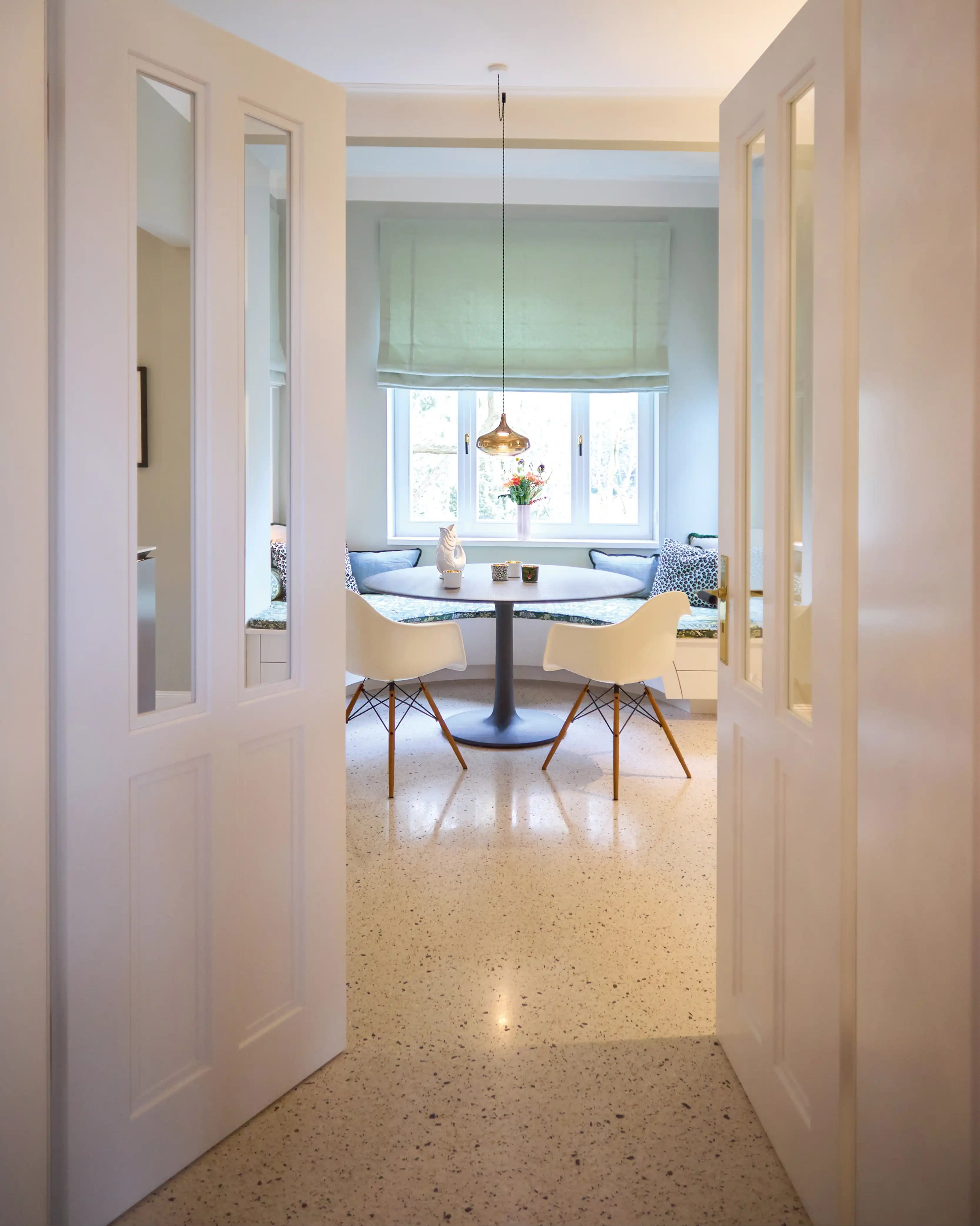 Die Anordnung der Räume innerhalb des Hauses wurde komplett überarbeitet. Aus der »guten Stube« wurde beispielsweise eine Wohnküche mit beliebtem Sitzplatz im Erker. Und die Küche verwandelte sich ins Wohnzimmer mit Gartenblick. Kunststofffenster wurden gegen neue denkmalgerechte Holzfenster getauscht. Die seitlichen Erker mussten komplett ersetzt werden. Auch beim Innenausbau wurde nicht gespart. Neben der Erneuerung der Betondecken, neuen Farben und Materialien kamen Einbaumöbel, Klassiker sowie neue Möbel zum Einsatz. Besonders über die schönen Türen aus Hamburg freut sich die Bauherrin, die dort einige Jahre gelebt hat, sehr. Sie stellen einen persönlichen Bezug her und runden das gelungene Zusammenspiel von alt und neu für ein perfektes Wohngefühl ab.