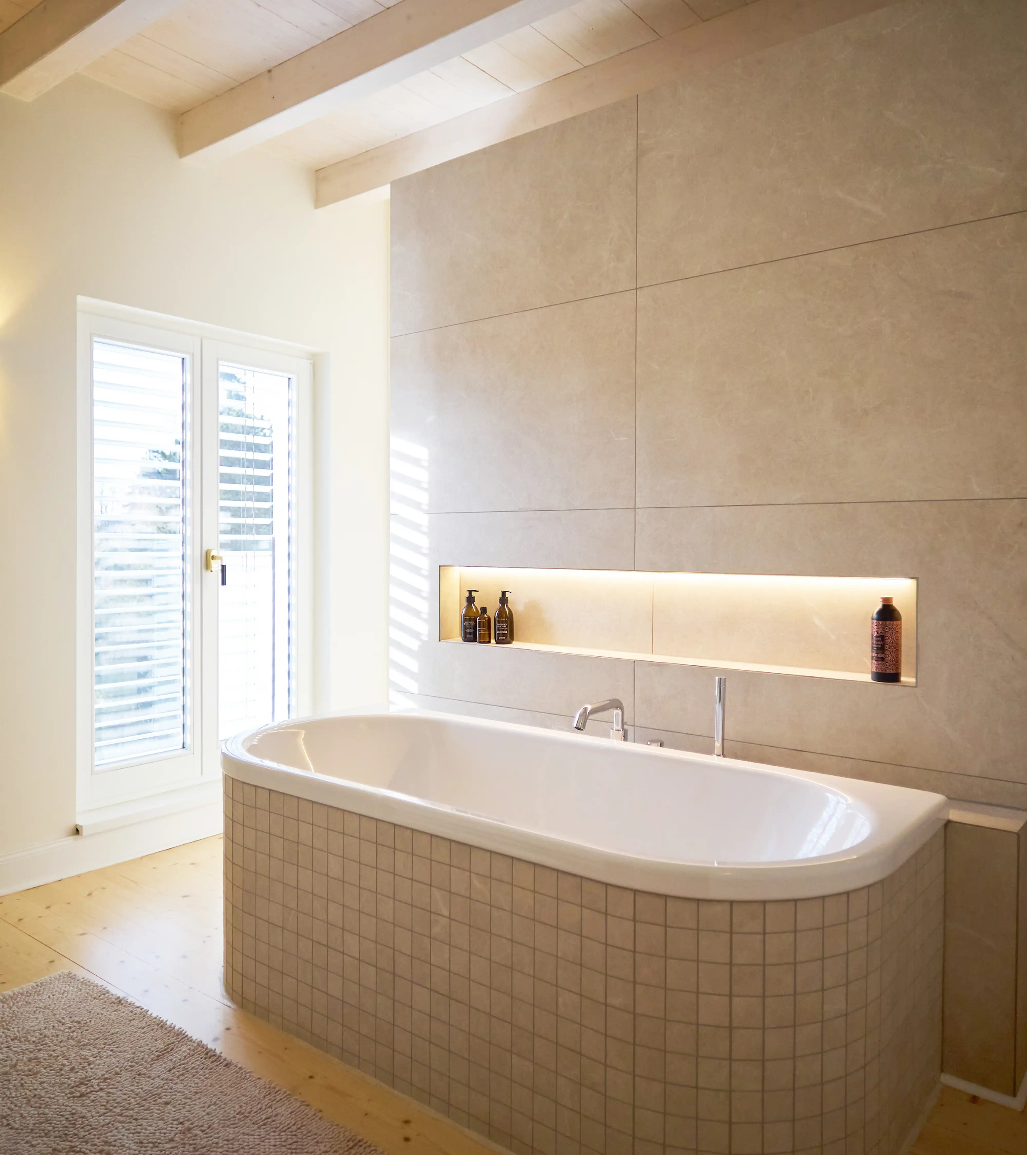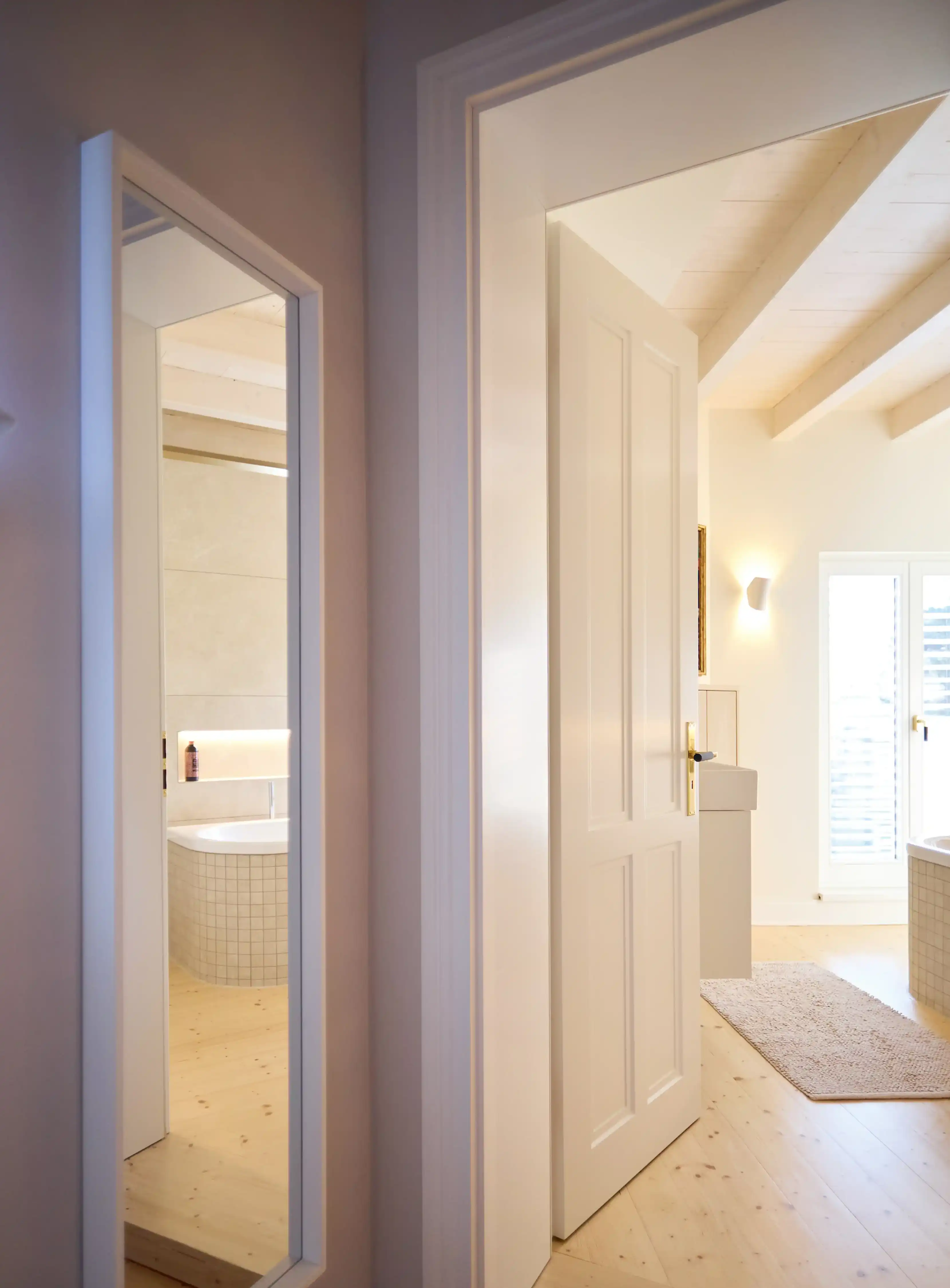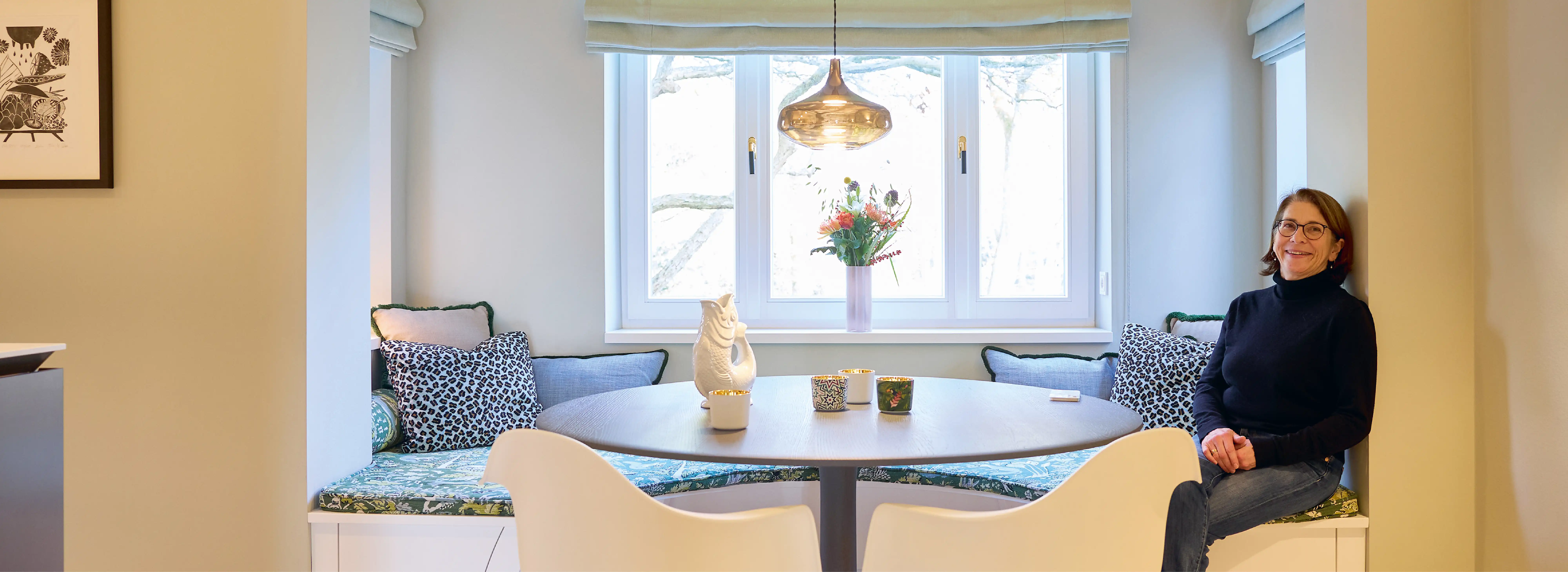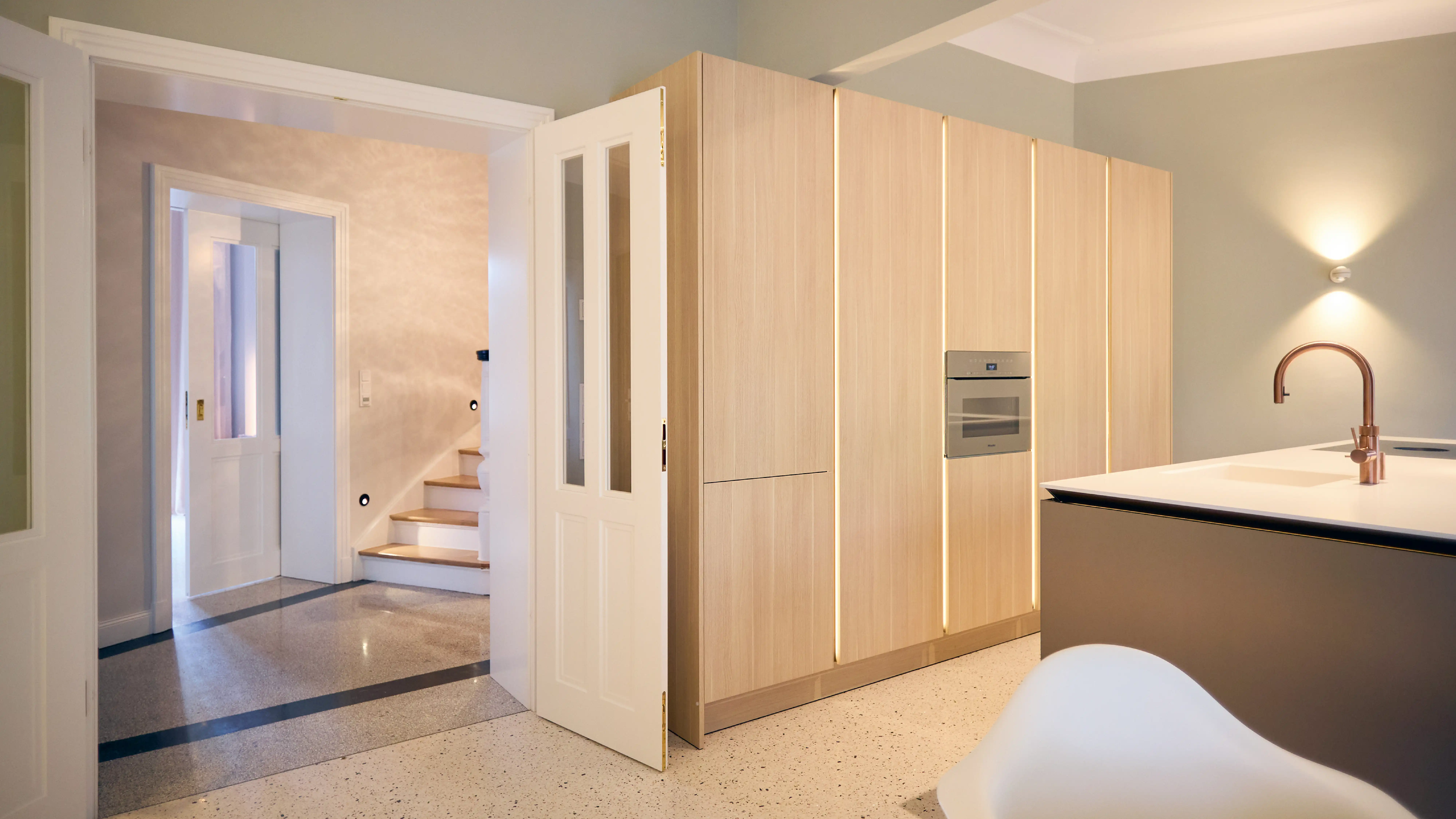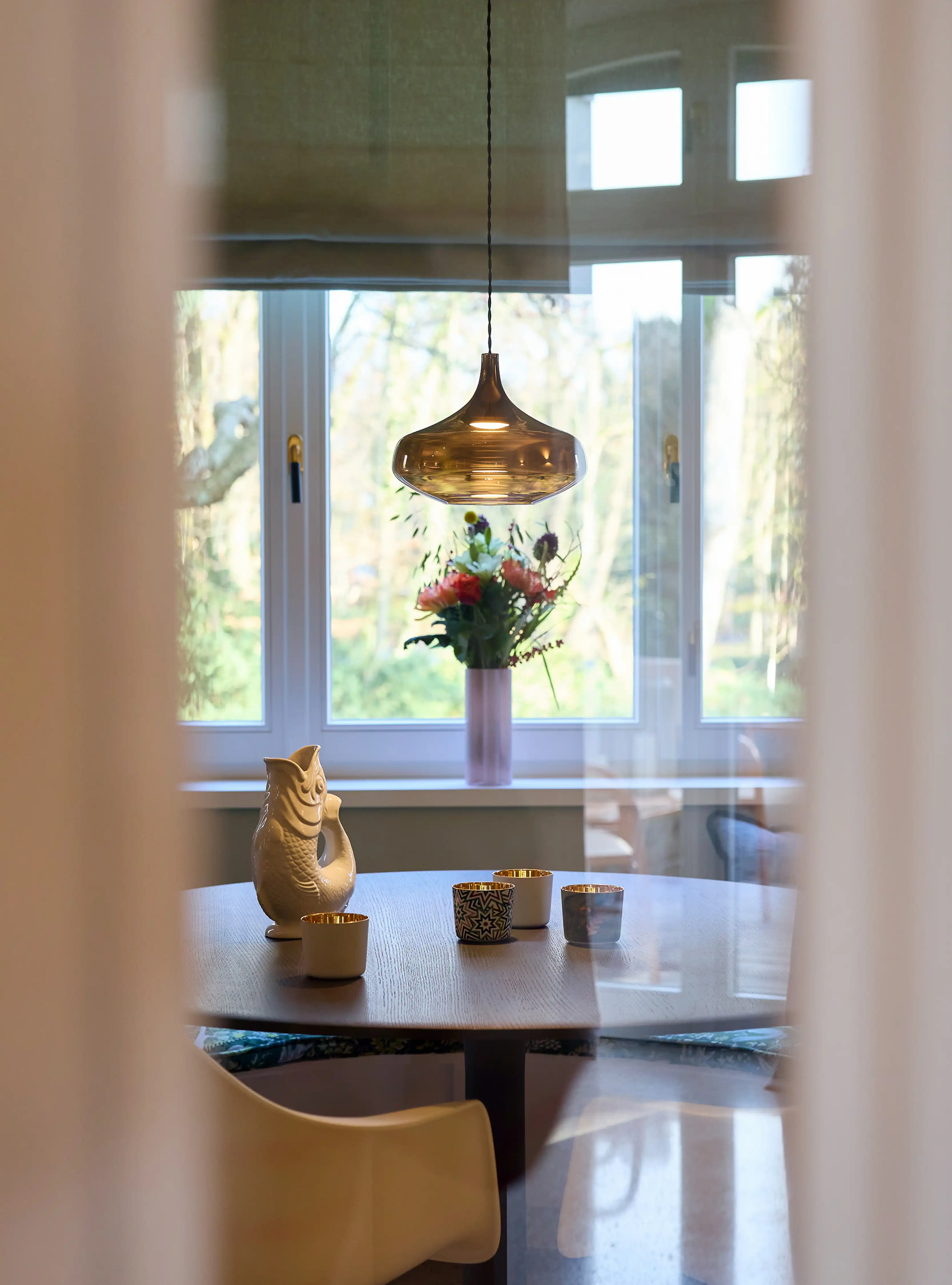Die Anordnung der Räume innerhalb des Hauses wurde komplett überarbeitet. Aus der »guten Stube« wurde beispielsweise eine Wohnküche mit beliebtem Sitzplatz im Erker. Und die Küche verwandelte sich ins Wohnzimmer mit Gartenblick. Kunststofffenster wurden gegen neue denkmalgerechte Holzfenster getauscht. Die seitlichen Erker mussten komplett ersetzt werden. Auch beim Innenausbau wurde nicht gespart. Neben der Erneuerung der Betondecken, neuen Farben und Materialien kamen Einbaumöbel, Klassiker sowie neue Möbel zum Einsatz. Besonders über die schönen Türen aus Hamburg freut sich die Bauherrin, die dort einige Jahre gelebt hat, sehr. Sie stellen einen persönlichen Bezug her und runden das gelungene Zusammenspiel von alt und neu für ein perfektes Wohngefühl ab.