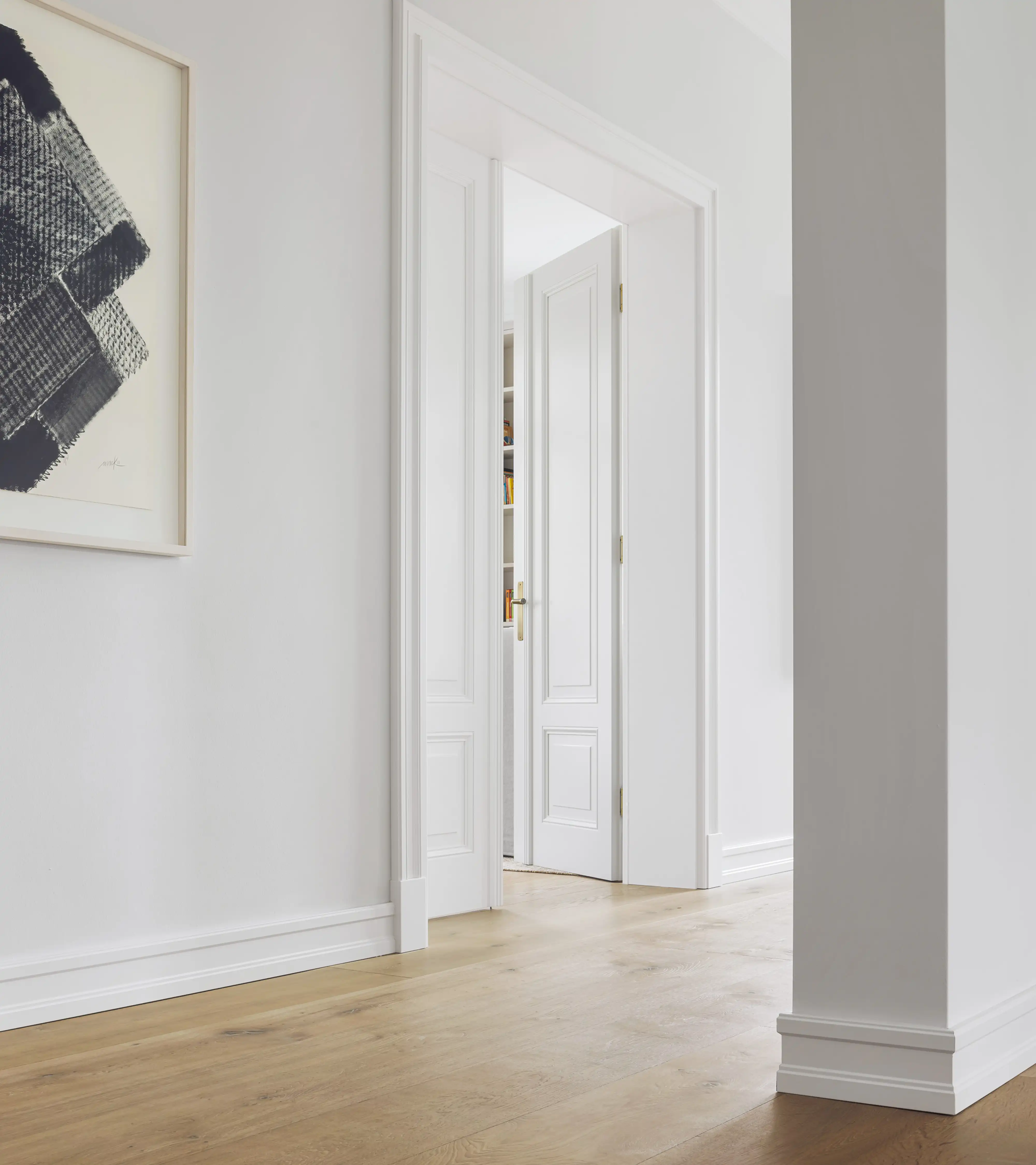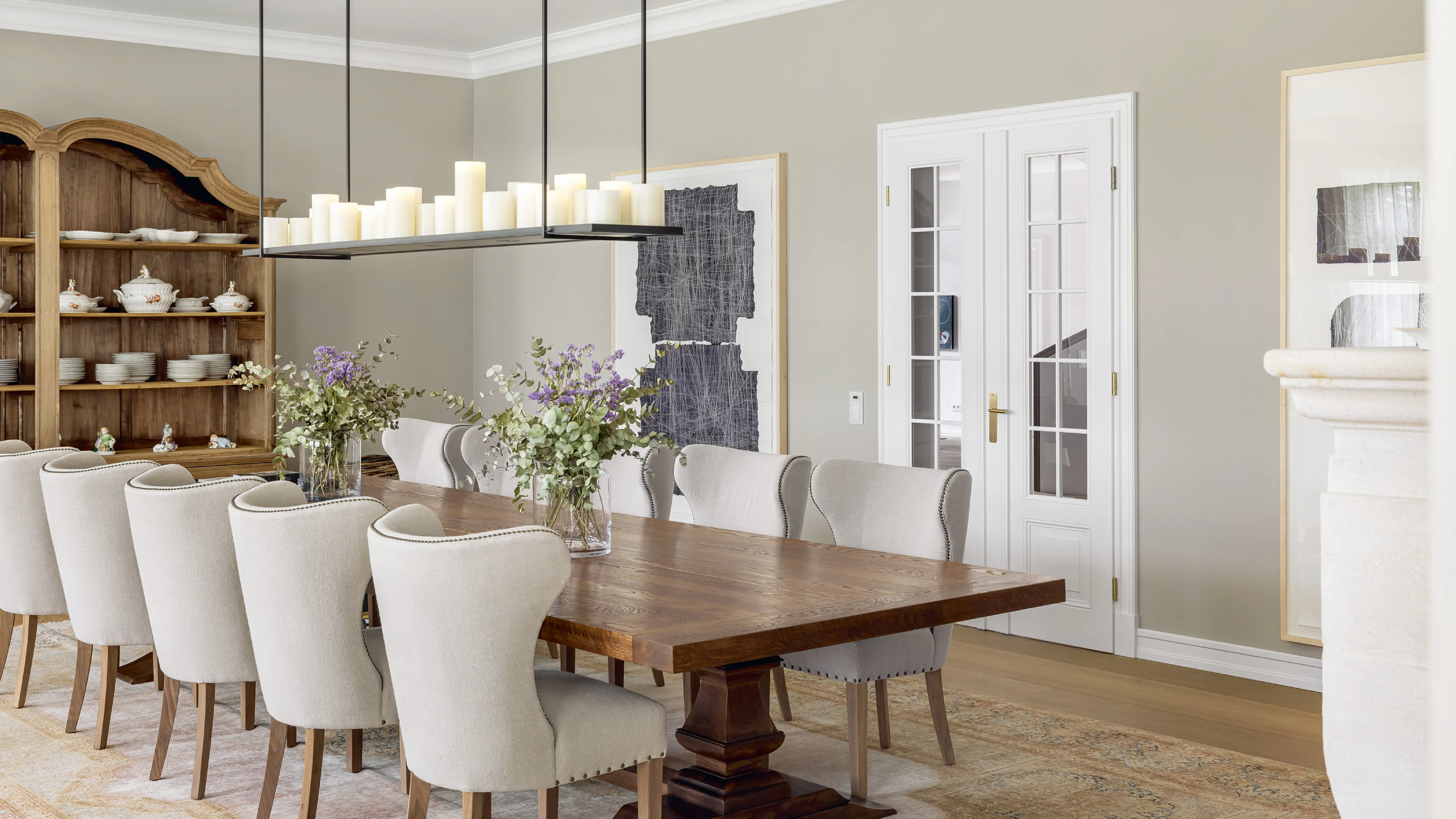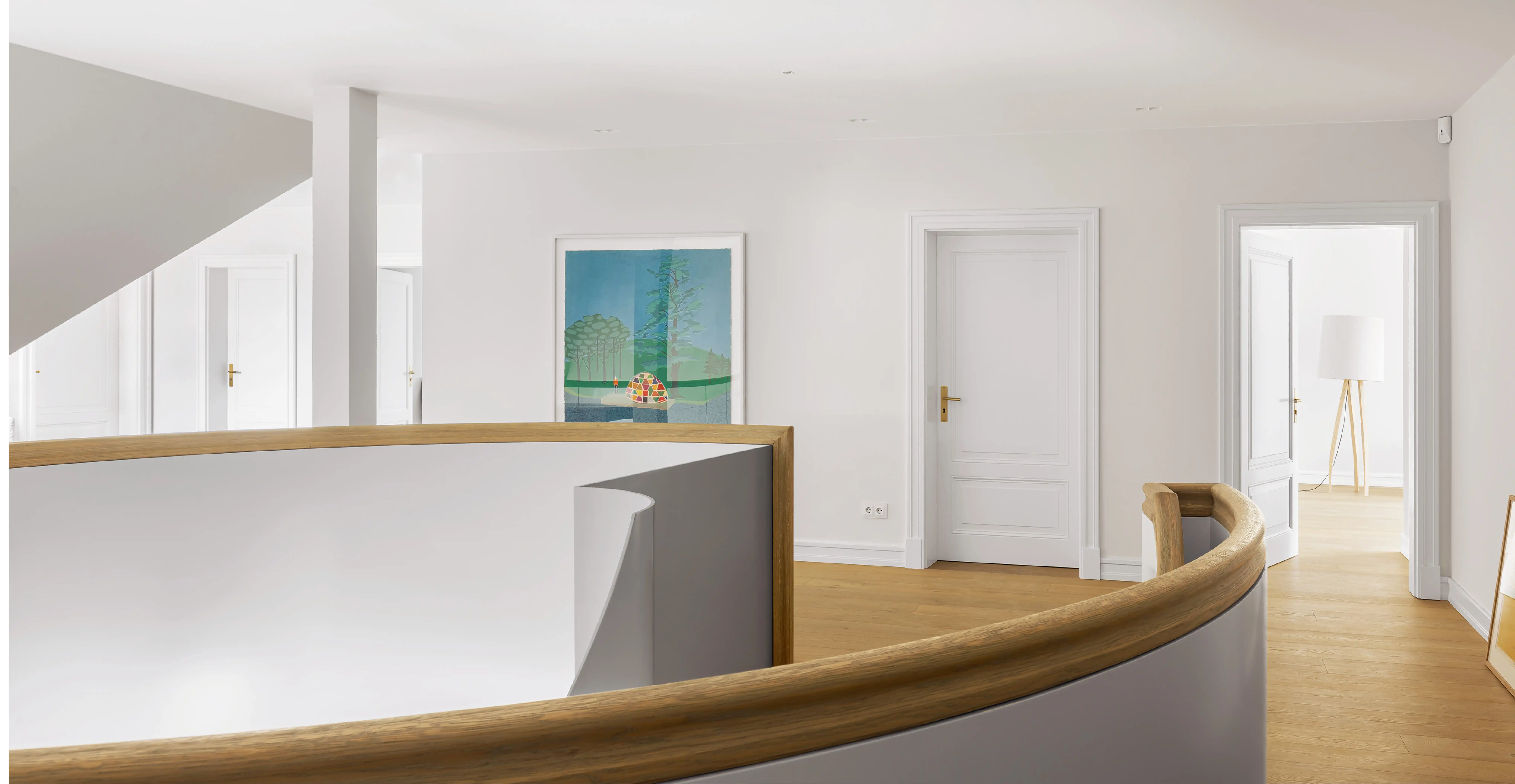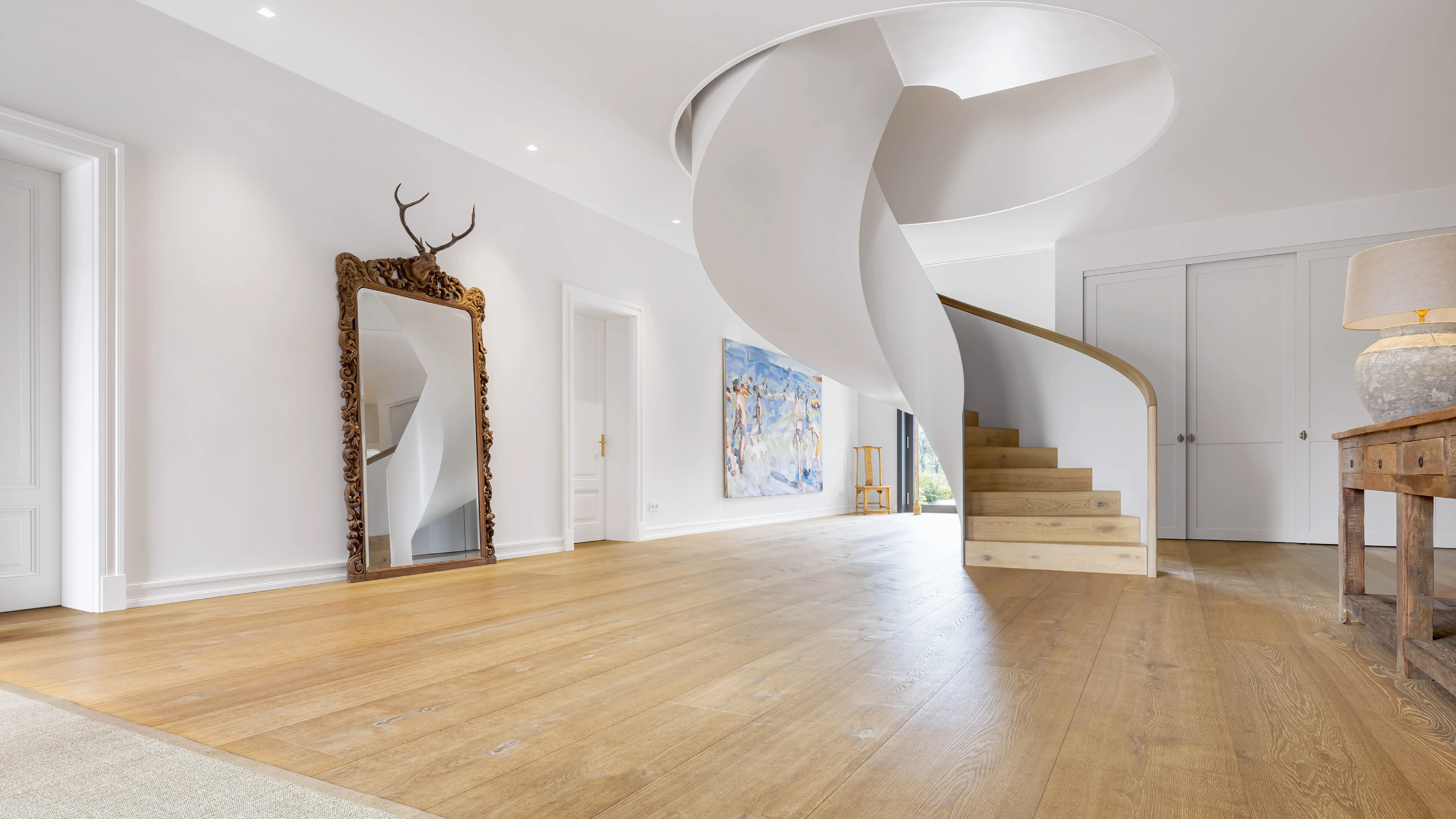 Auf ein Haus in diesen Dimensionen trifft man nicht alle Tage. Schon beim Eintreten wird man durch Größe empfangen. Und so ist auch die gesamte Ausstrahlung, die das Haus freigibt. Großzügigkeit ist das Motto für die Räume, Zurückhaltung für die Ausstattung. Die ist schlicht, unaufdringlich und sanft in der Farbgebung. Und so fügen sich auch die gewählten Denkmmalschutz- und Villentüren wie selbstverständlich in das übrige Interieur ein und bedeuten eine Wohltat für Menschen, für die Innenarchitektur und schöne Räume ein Grundbedürfnis sind.