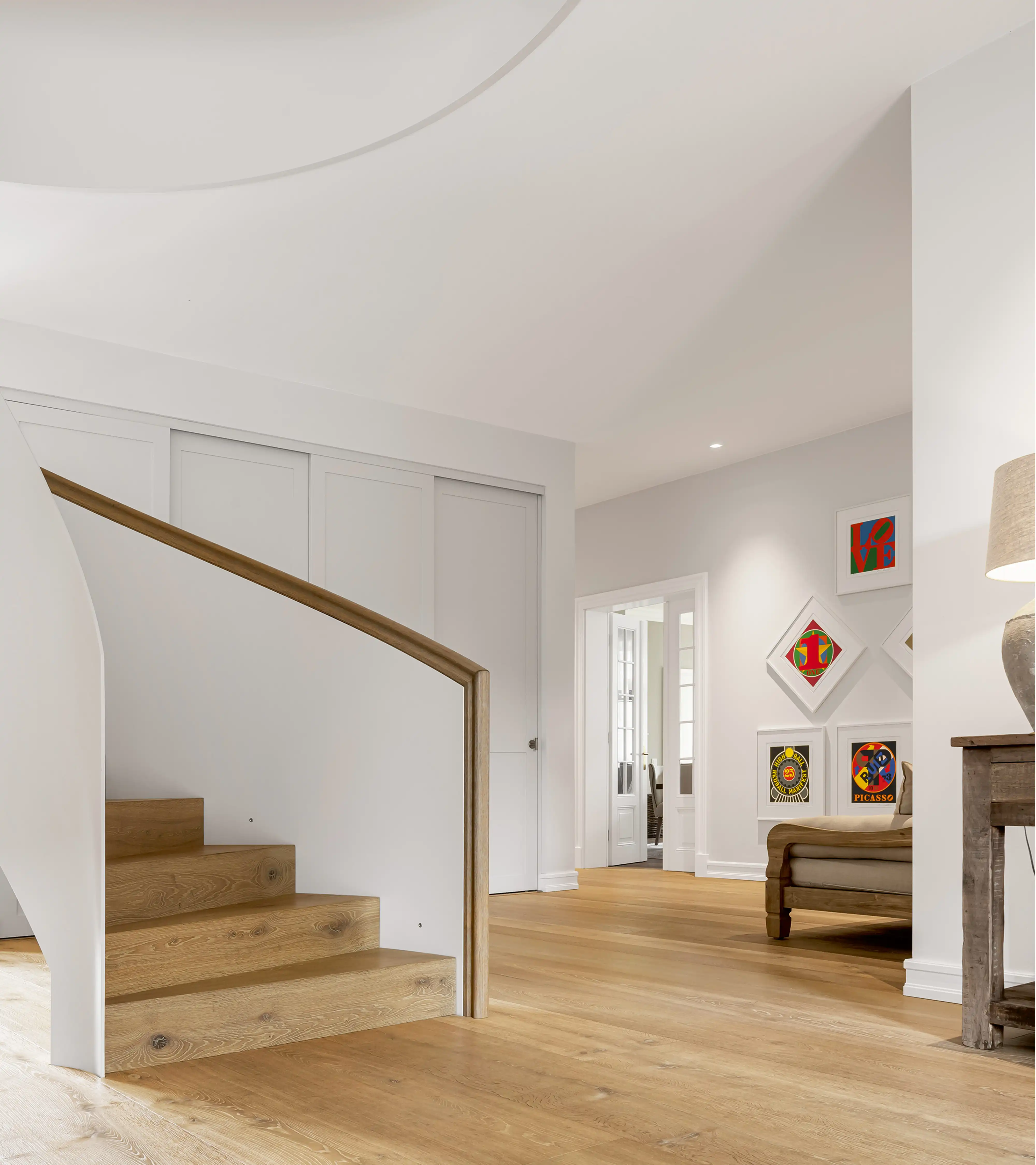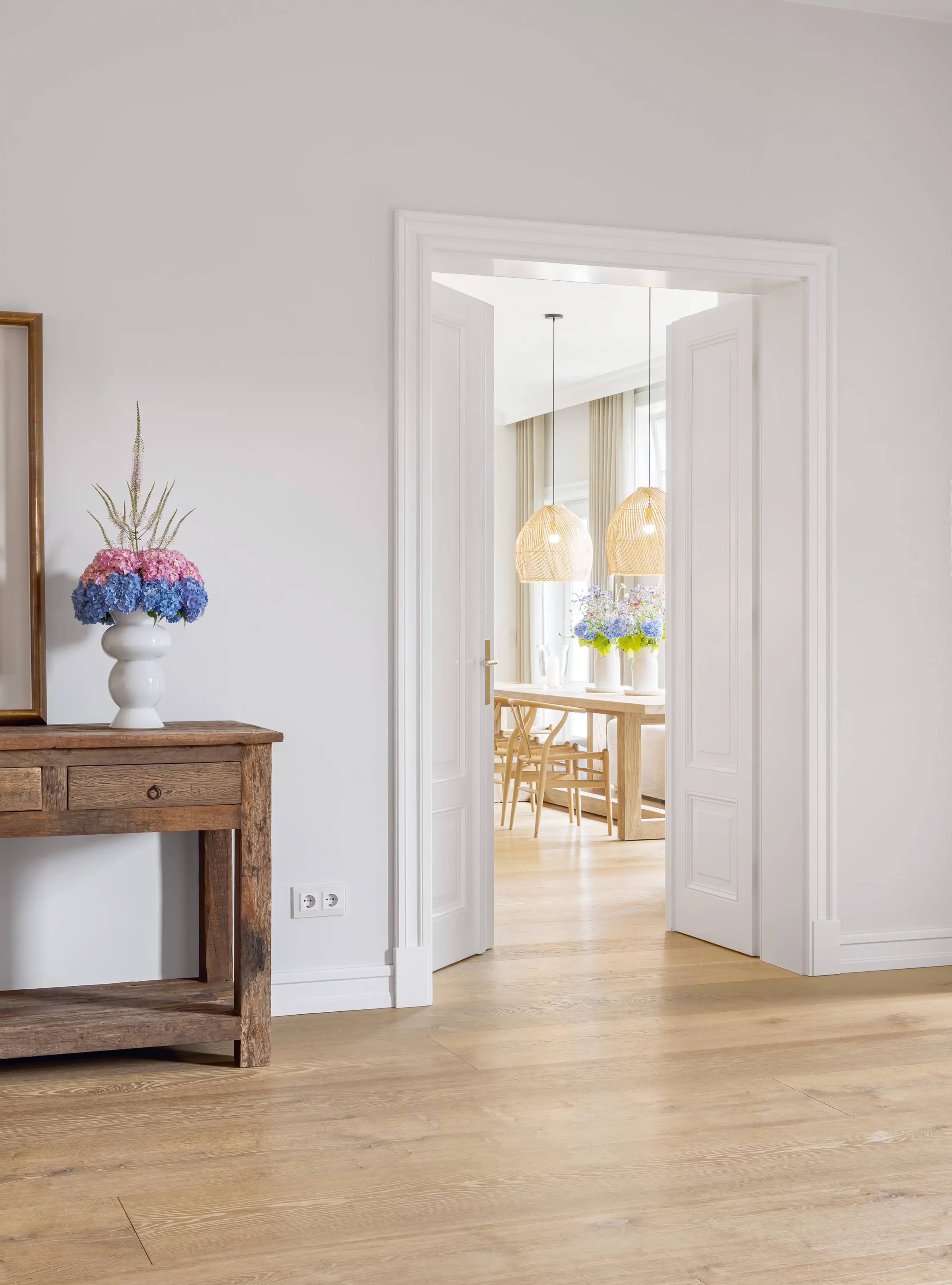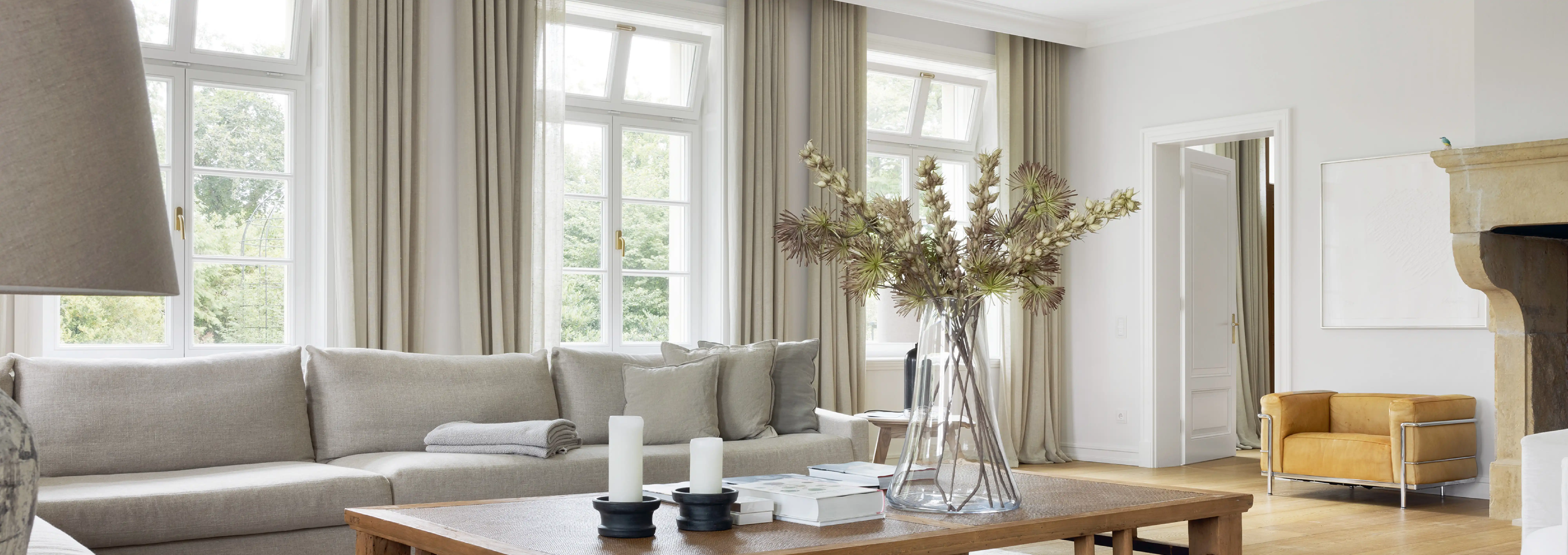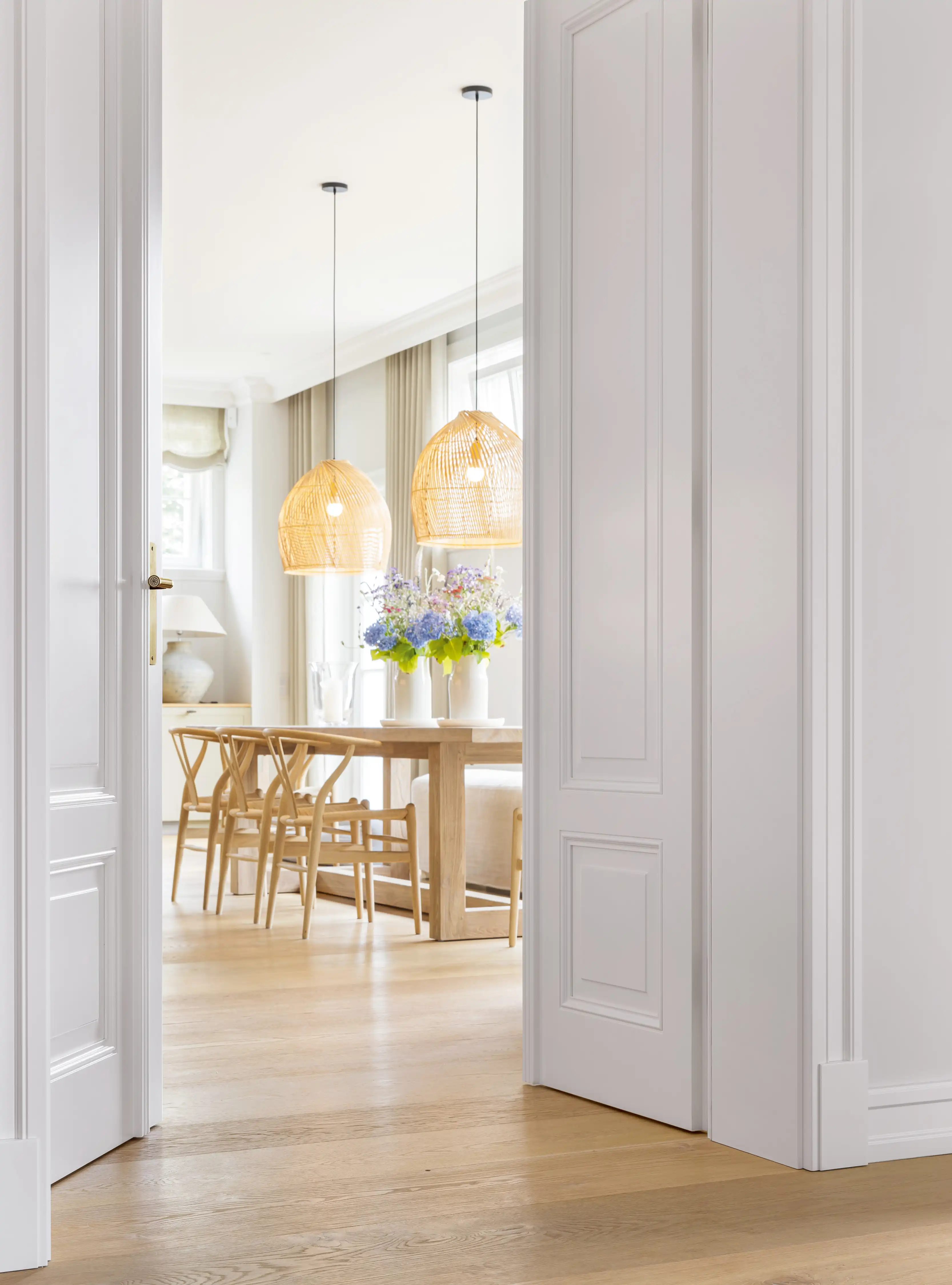 Auf ein Haus in diesen Dimensionen trifft man nicht alle Tage. Schon beim Eintreten wird man durch Größe empfangen. Und so ist auch die gesamte Ausstrahlung, die das Haus freigibt. Großzügigkeit ist das Motto für die Räume, Zurückhaltung für die Ausstattung. Die ist schlicht, unaufdringlich und sanft in der Farbgebung. Und so fügen sich auch die gewählten Denkmmalschutz- und Villentüren wie selbstverständlich in das übrige Interieur ein und bedeuten eine Wohltat für Menschen, für die Innenarchitektur und schöne Räume ein Grundbedürfnis sind.